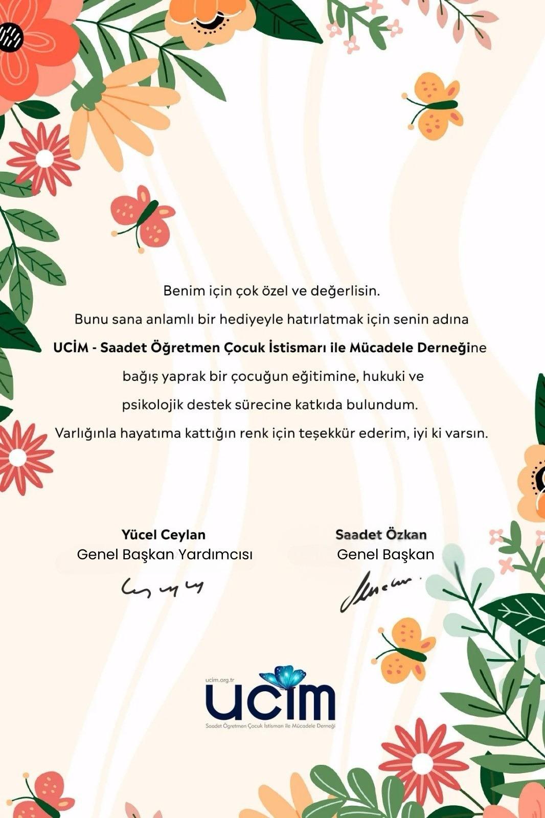 • Özel günlerinizi kutlamak için SAADET ÖĞRETMEN ÇOCUK İSTİSMARI İLE MÜCADELE DERNEĞİ İKTİSADİ İŞLETMESİ ‘' iyi Varsın'' Destek Kartını satın alarak hem sevdiklerinize anlamlı bir hediye verebilir hem de yapacağınız destekle KAHRAMAN ÇOCUKLARIMIZA ücretsiz hukuk ,danışmanlık ,burs ve nitelikli bir eğitim armağan ederek onlara umut ışığı olabilirsiniz.