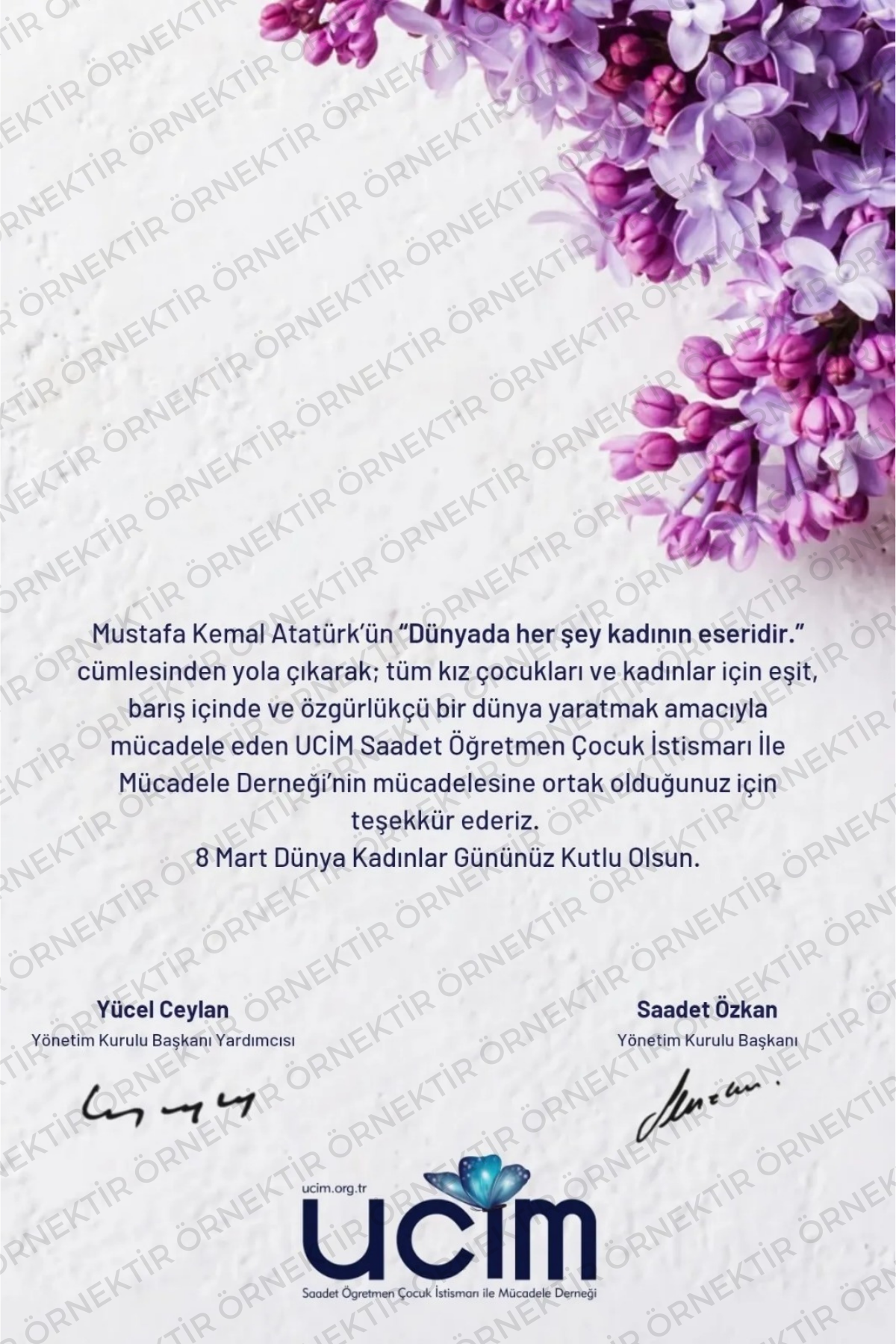 Bu ürün UCİM tarafından basılı olarak kargo yoluyla gönderilecektir. Bu üründen en fazla 10 adet sipariş verilebilir. 10 adedin üzerindeki siparişleri UCİM iptal etme hakkını saklı tutar. Belirlenen bu limit kurumsal siparişlerde geçerli olmayıp, kurumsal siparişler için farklı limitler belirlenebilmektedir. Özel günlerinizi kutlamak için SAADET ÖĞRETMEN ÇOCUK İSTİSMARI İLE MÜCADELE DERNEĞİ İKTİSADİ İŞLETMESİ ‘’Kadınlar Günü'' Destek Kartını satın alarak hem sevdiklerinize anlamlı bir hediye verebilir hem de yapacağınız destekle KAHRAMAN ÇOCUKLARIMIZA ücretsiz hukuk ,danışmanlık ,burs ve nitelikli bir eğitim armağan ederek onlara umut ışığı olabilirsiniz.